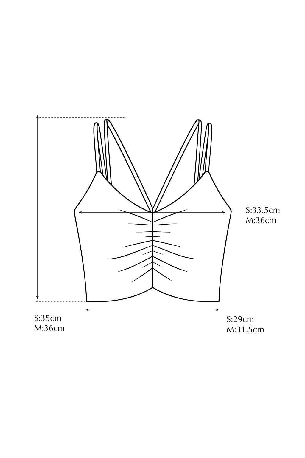 華奢ストラップがデコルテの上で重ね、センターに細かなギャザーを寄せたミニマルなブラトップ。胸元はやわらかなカーブで女性らしく、やや短めの丈でウエスト位置を高く見せます。背中はすっきりとしたWストラップで、ヘルシー&上品のバランスにこだわりました。