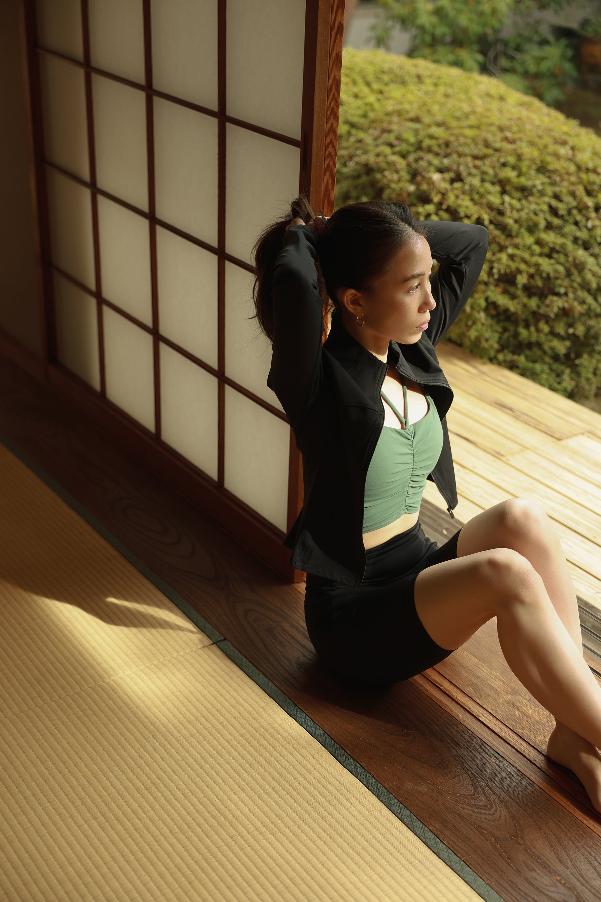 360°ストレッチのなめらか素材が動きに合わせてフィット。汗ばむシーンでも乾きやすく、型くずれしにくいのが魅力ポイント。アンダーはほどよいホールド感で、ヨガや軽いワークアウト、デイリーのレイヤードにも使いやすい安定設計。
