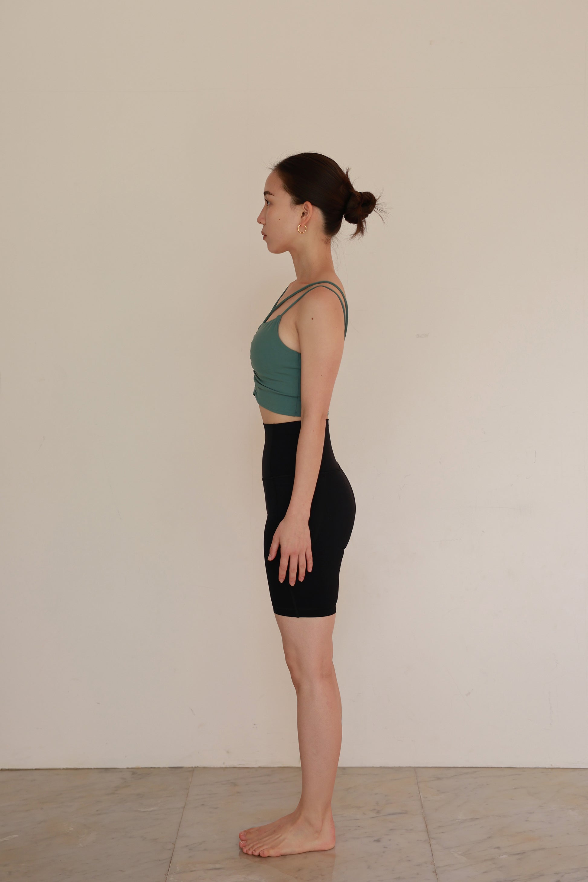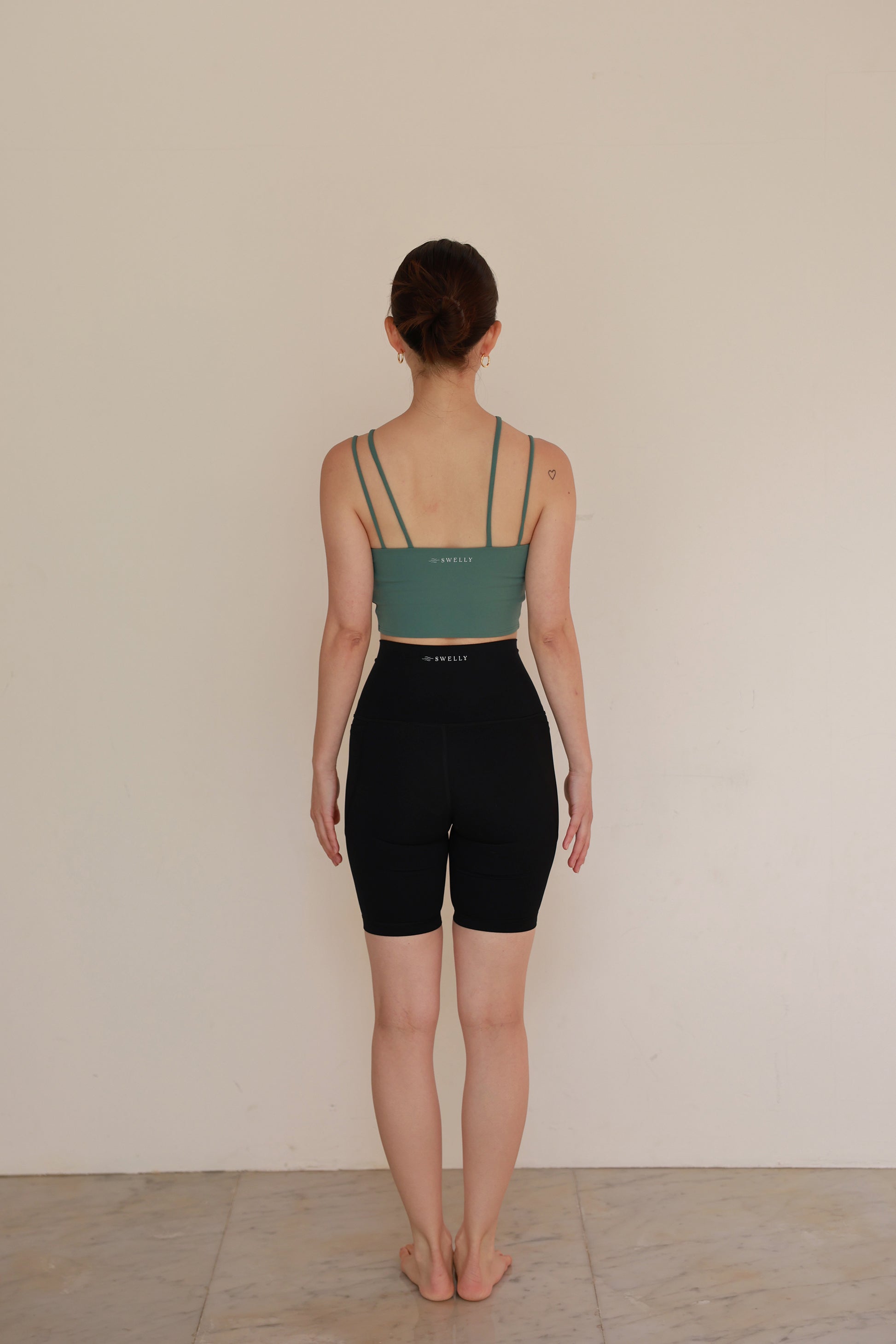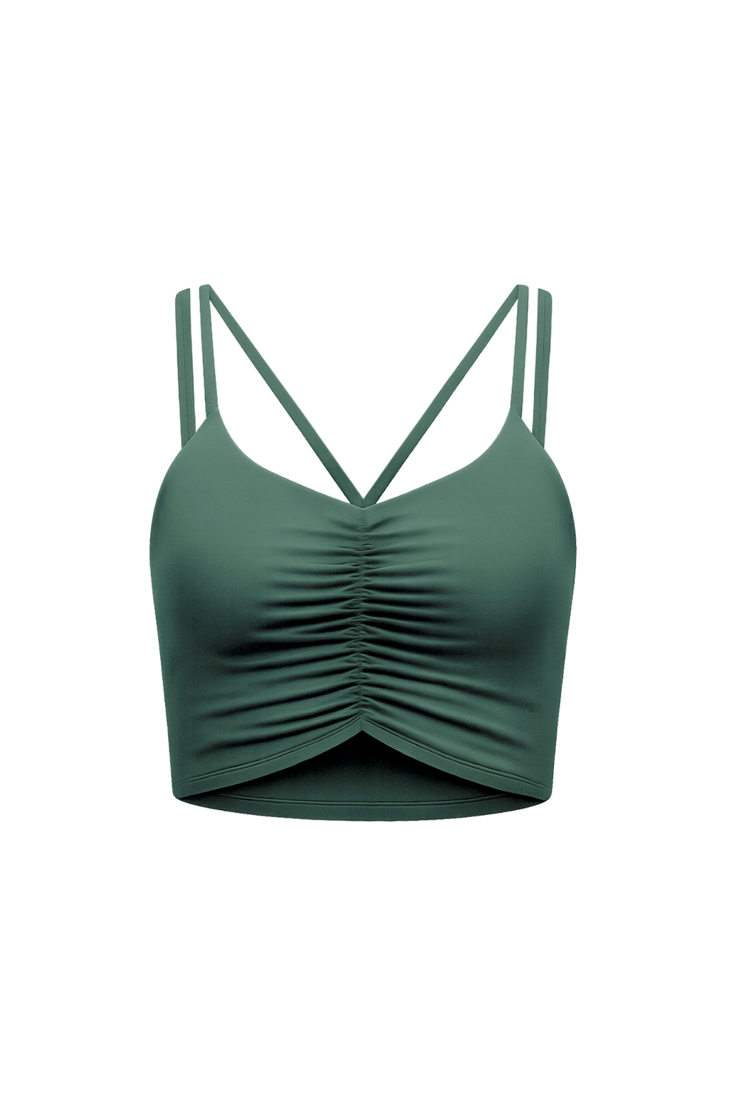 華奢ストラップがデコルテの上で重ね、センターに細かなギャザーを寄せたミニマルなブラトップ。胸元はやわらかなカーブで女性らしく、やや短めの丈でウエスト位置を高く見せます。背中はすっきりとしたWストラップで、ヘルシー&上品のバランスにこだわりました。
