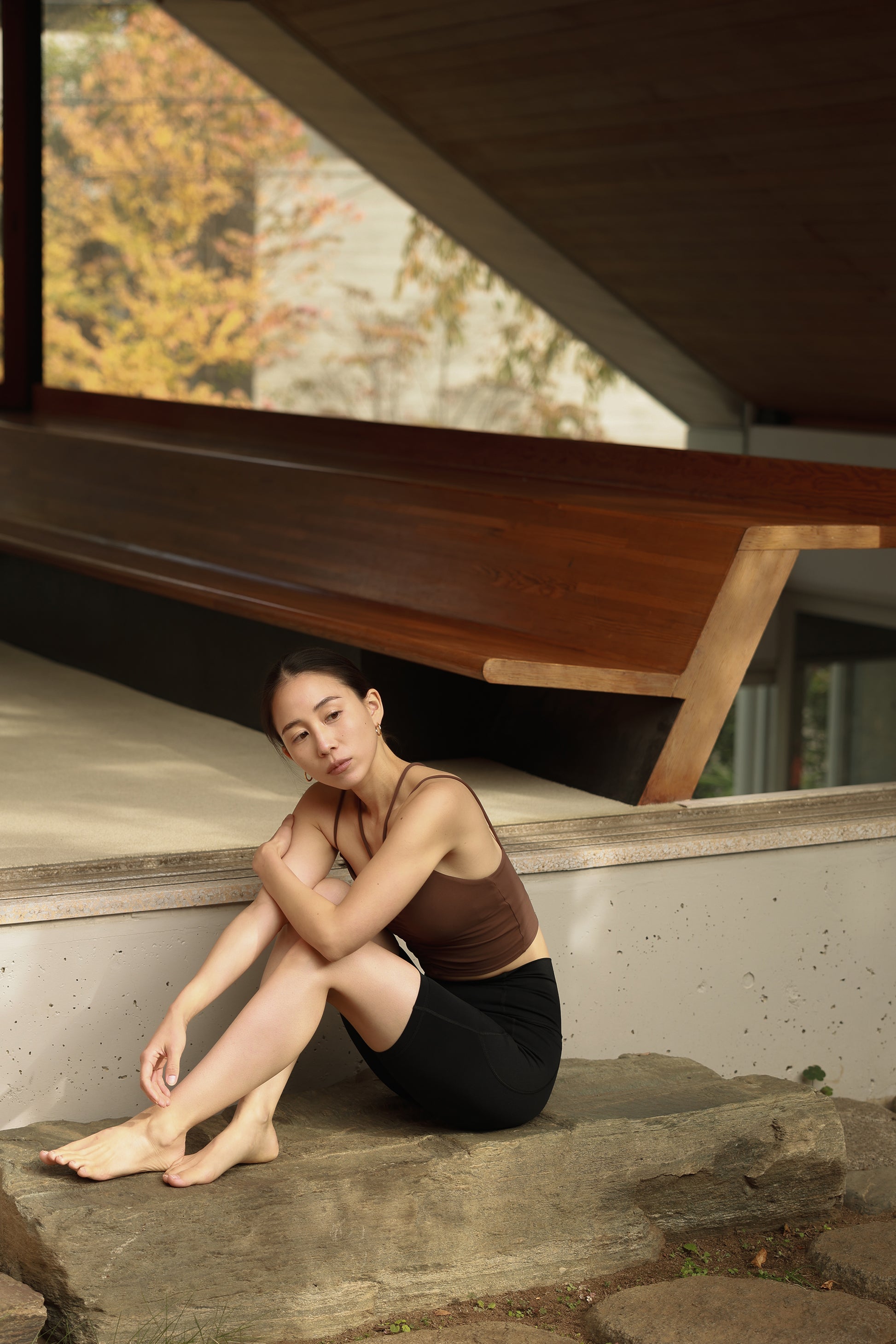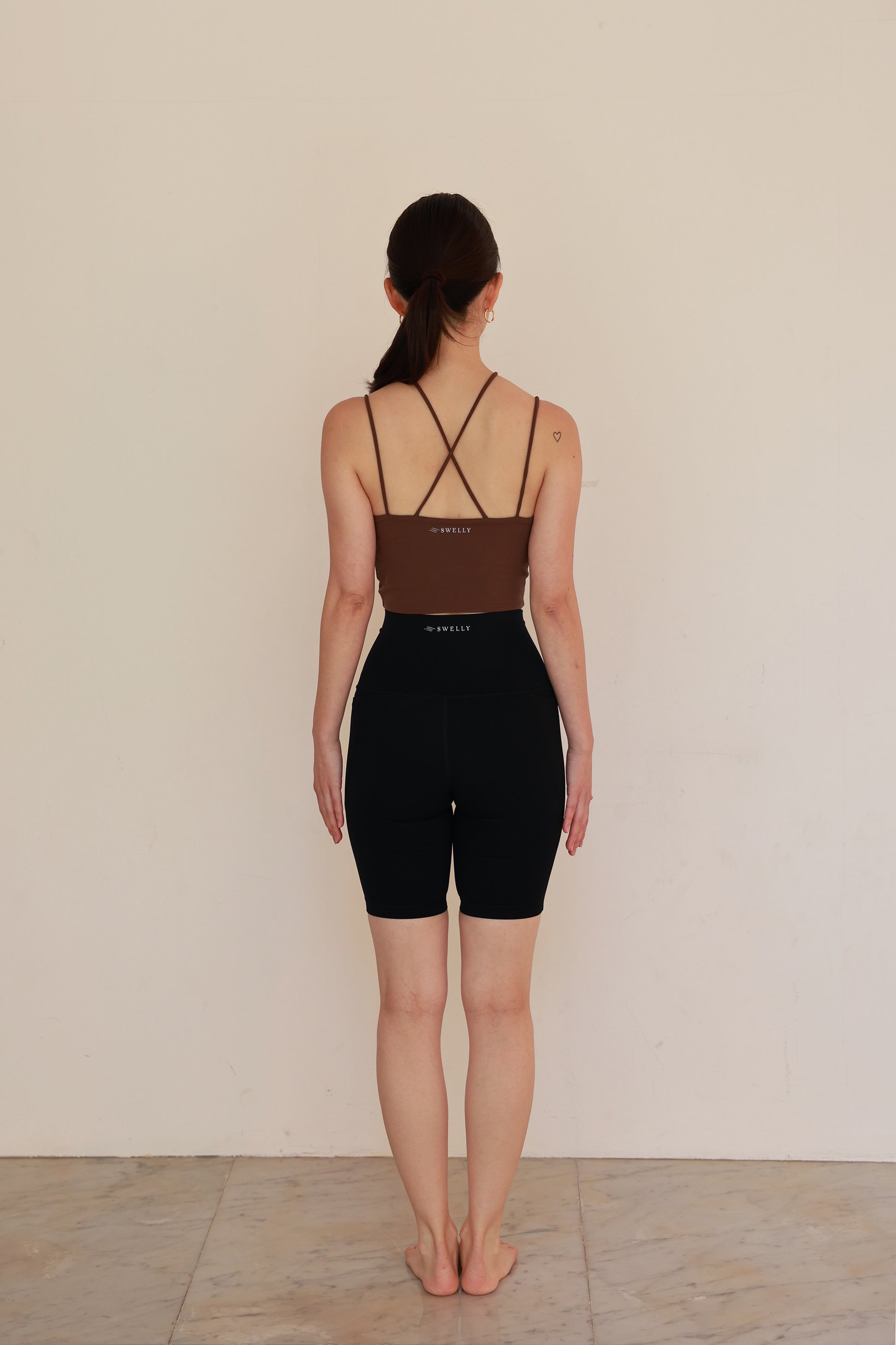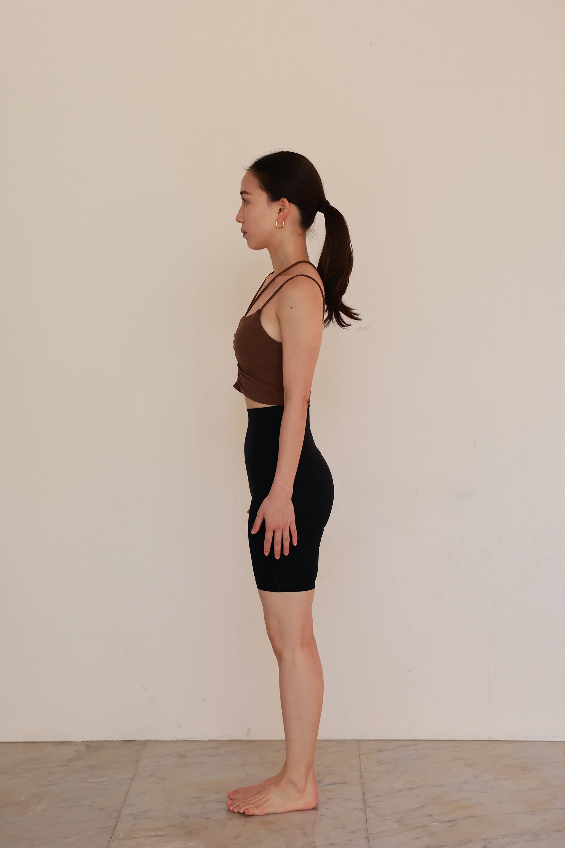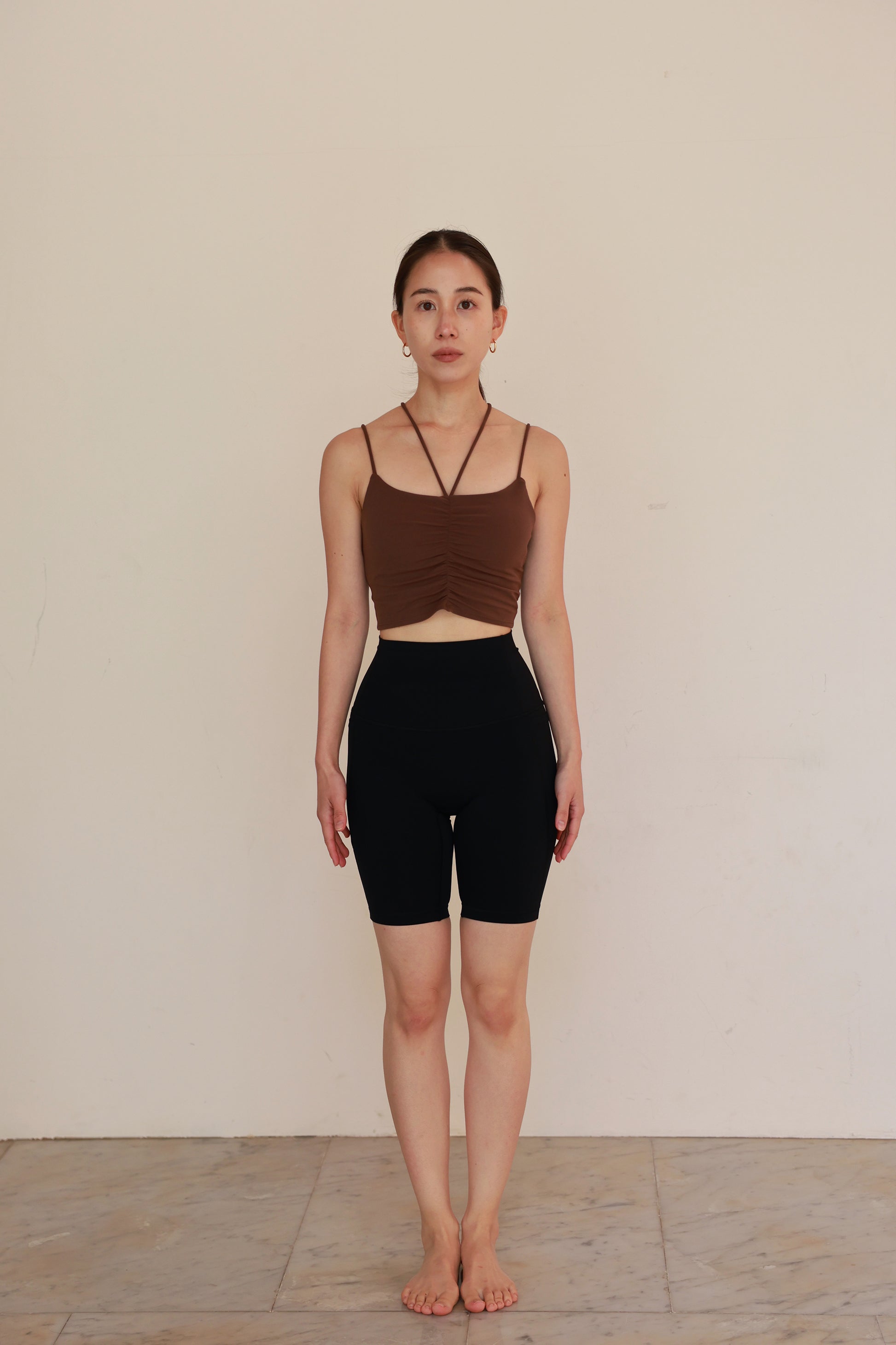 華奢ストラップがデコルテの上で重ね、センターに細かなギャザーを寄せたミニマルなブラトップ。胸元はやわらかなカーブで女性らしく、やや短めの丈でウエスト位置を高く見せます。背中はすっきりとしたWストラップで、ヘルシー&上品のバランスにこだわりました。