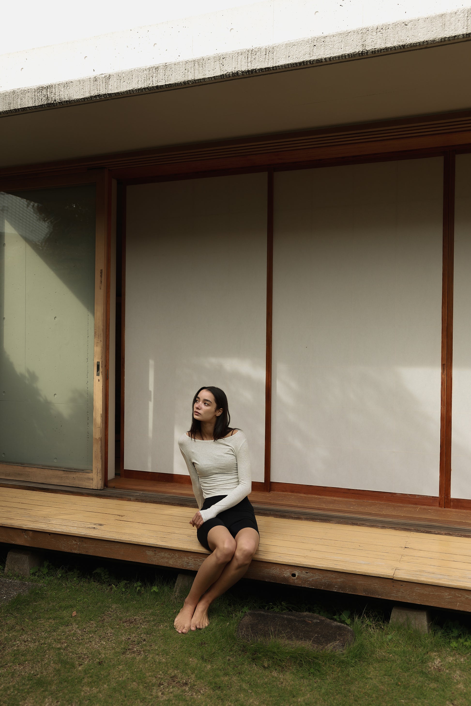 ボートネックの横広ラインが鎖骨をきれいに見せるロンT。両サイドの細かなギャザーでウエスト位置を高く、スタイル良く魅せてくれる一枚。からだに寄り添うタイトめシルエットでも、リブの縦ラインがすっきり見えを叶えます。軽やかな杢グレーで、スポーティさと上品さのちょうど真ん中。