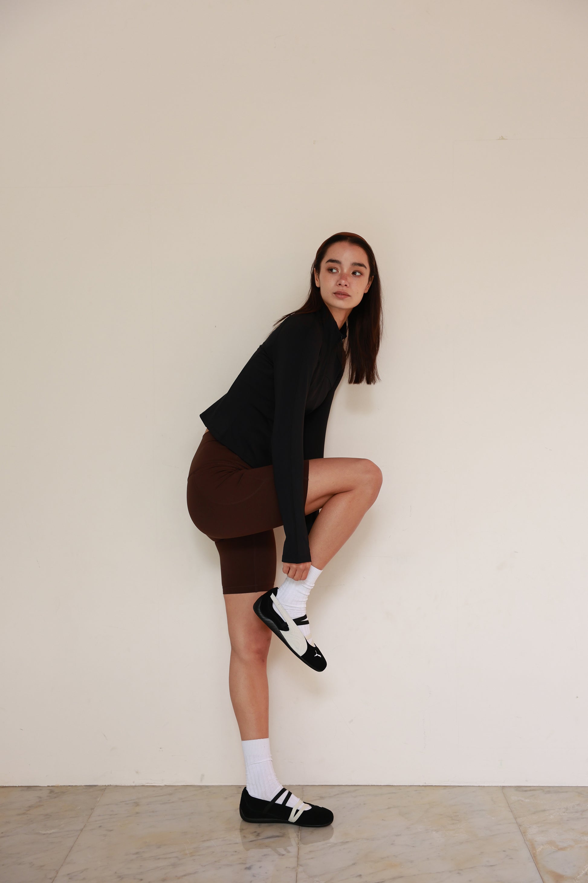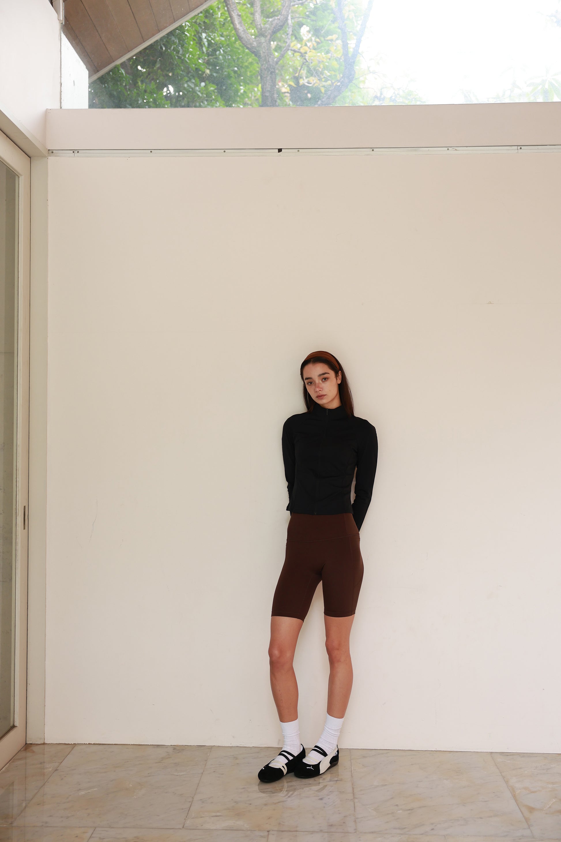体に沿う細身シルエットと、ほどよい着丈でスタイルアップするジャケット。襟元がスタンドカラーとフロントジップのミニマルな表情に、胸下~ウエストへ流れる切り替えがボディラインを綺麗に見せてくれます。スポーティすぎない、都会的なフルジップジャケットです。