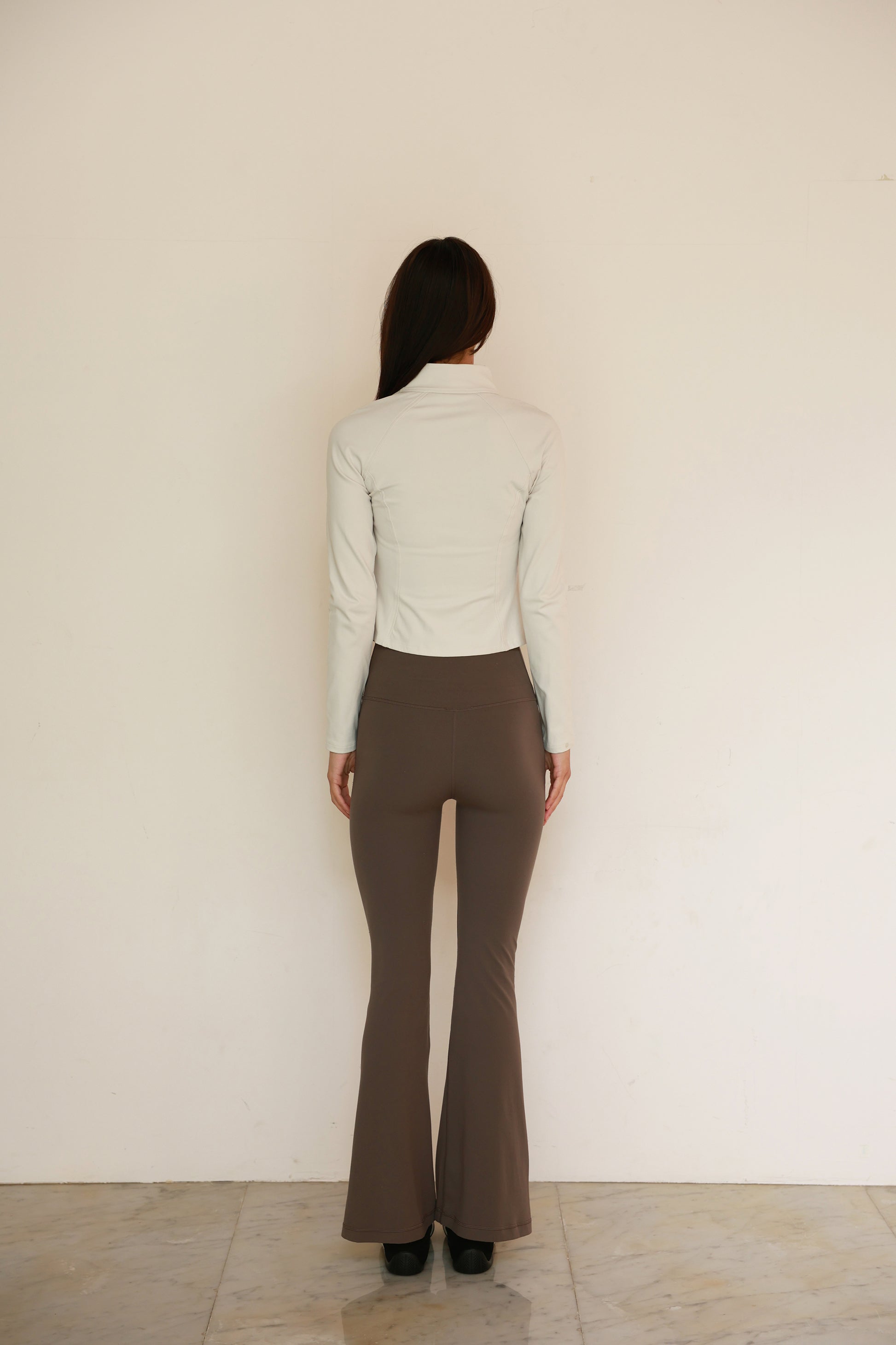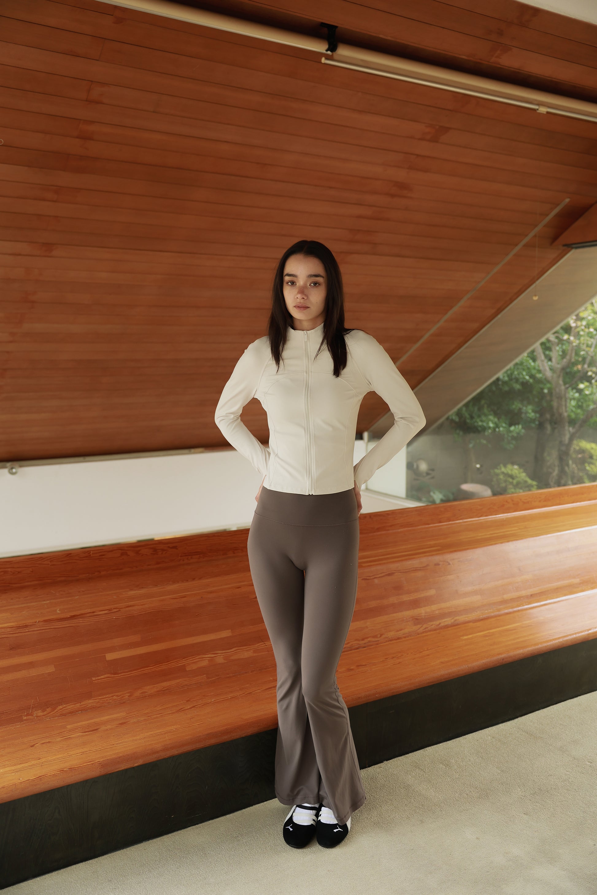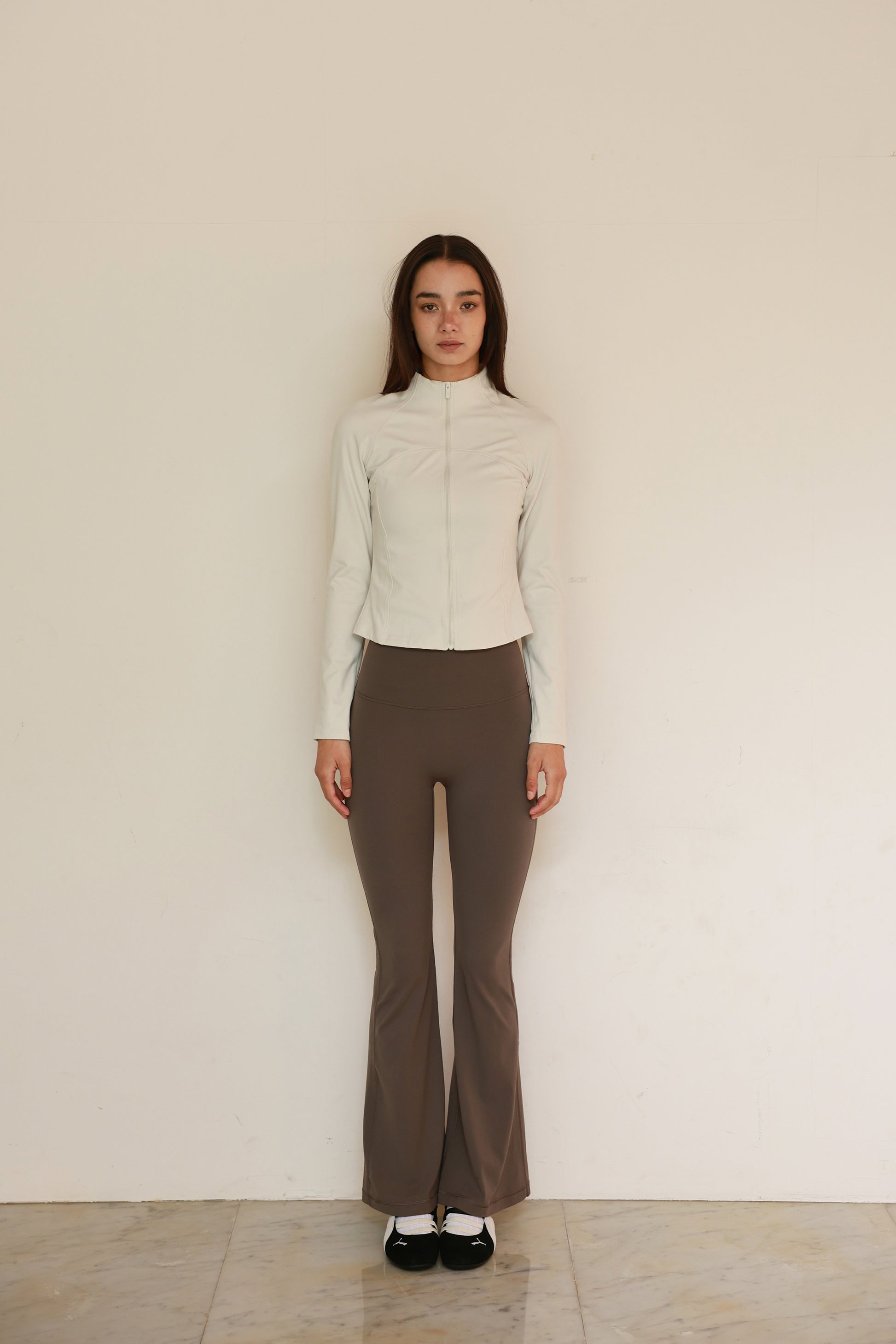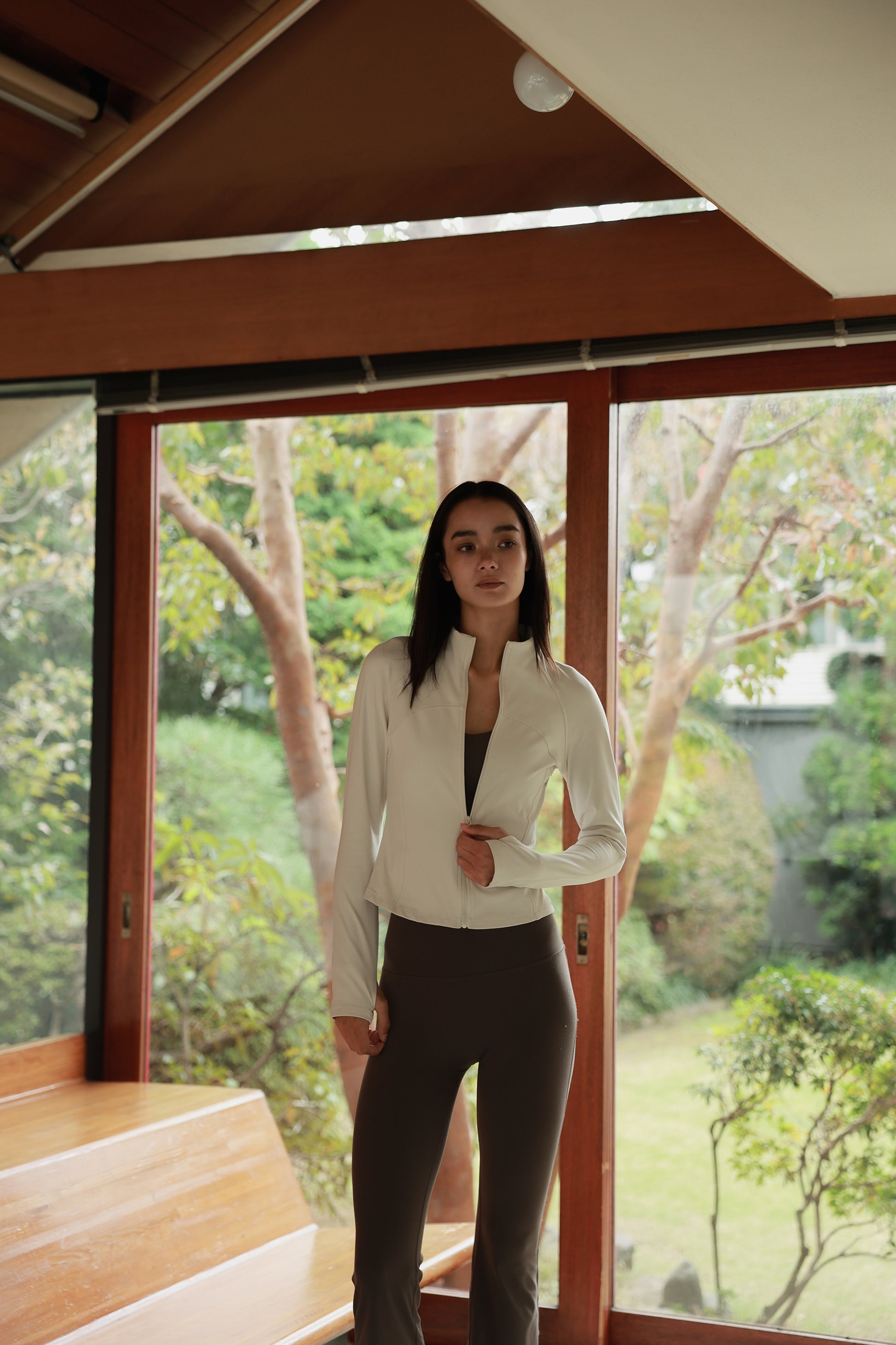 体に沿う細身シルエットと、ほどよい着丈でスタイルアップするジャケット。襟元がスタンドカラーとフロントジップのミニマルな表情に、胸下~ウエストへ流れる切り替えがボディラインを綺麗に見せてくれます。スポーティすぎない、都会的なフルジップジャケットです。