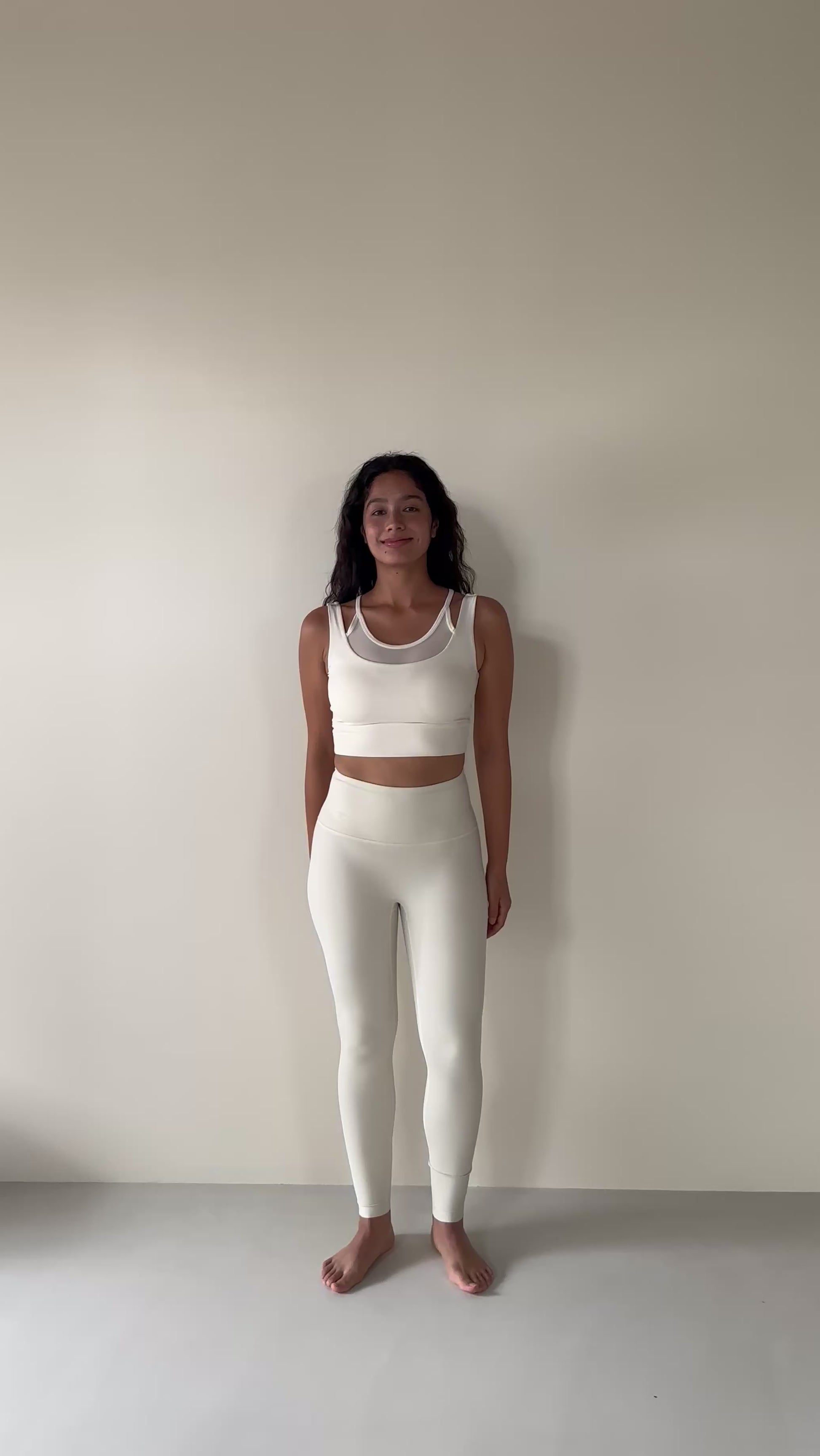 柔らかなカーブラインにメッシュ付きのフロント、背中に繊細なストラップをあしらったレイヤードブラトップ。胸元を露わにせず、ウエストもさりげなく露出、エレガントなバックスタイルを実現してくれるデザイン。